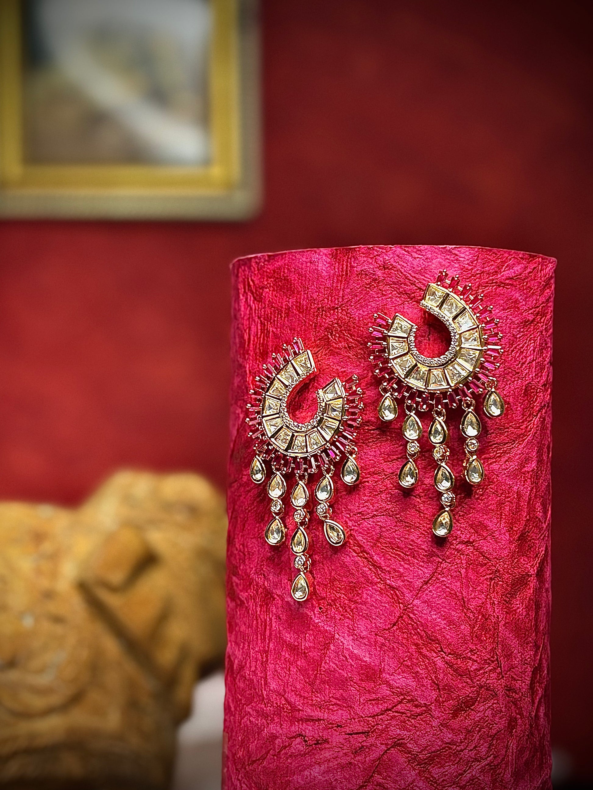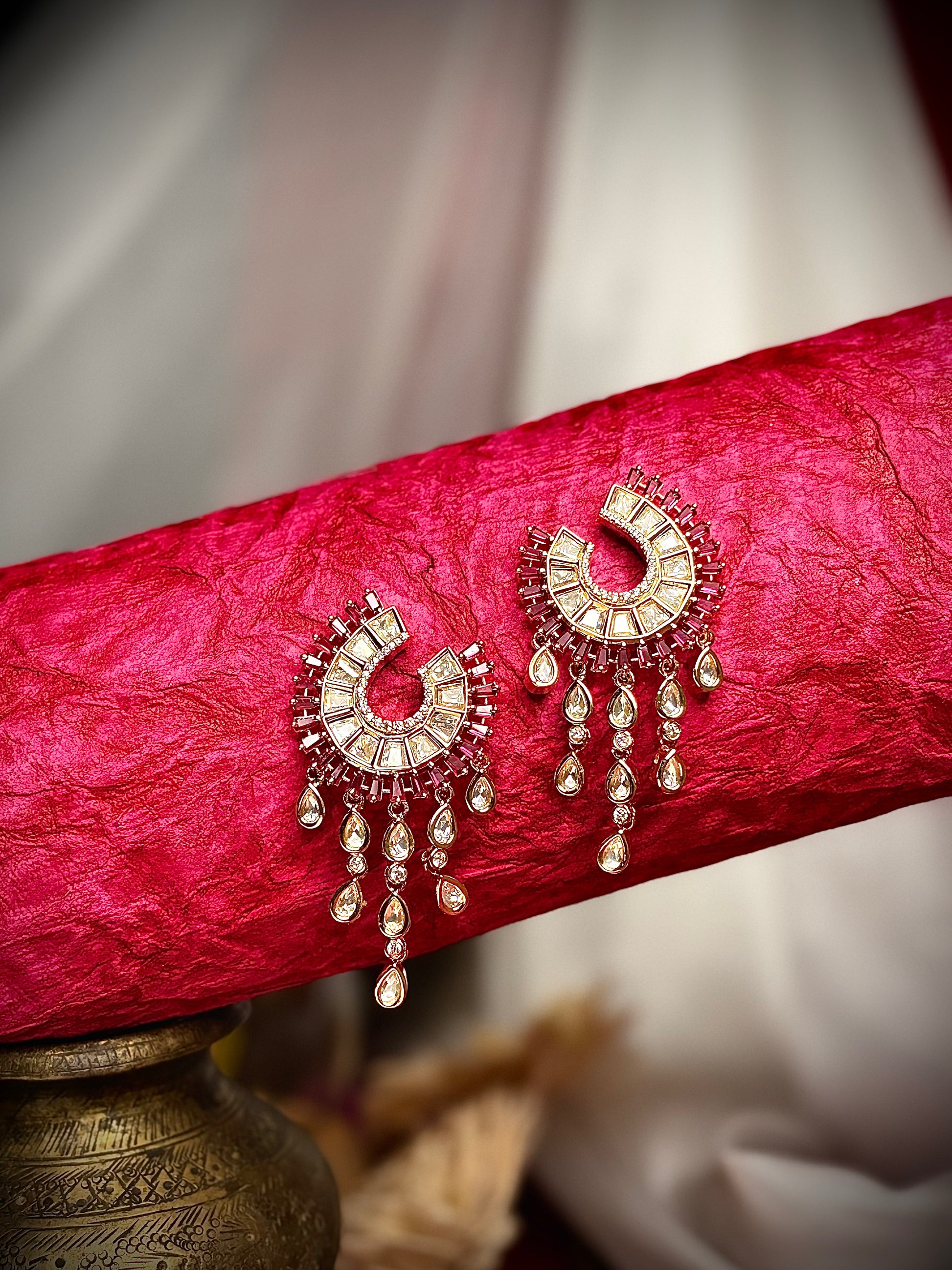 Elegant chandbali earrings adorned with sparkling stones and tear-shaped droplets, perfect for festive and bridal wear.